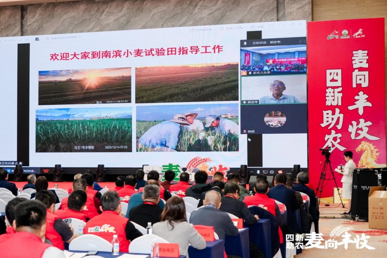 科研领航:“麦痴”泰斗视频连线,揭晓高产节水硬核成果 全国人大代表、农业农村部小麦指导组专家郭进考因海南育种工作以视频连线形式分享。会上,他重点推介了联合培育的 “马兰1号”具备抗倒、高产、抗逆、节水等优良特性。该品种已成为黄淮海北麦片区第一大单品,在2025年连续三次打破河北省小麦高产记录,最高亩产869.93公斤纪录,山东省最高亩产898公斤,多年多点实现超高产破纪录。他深入阐释了新品种、新技术、新装备、新农人 “四新”现代农业发展模式融合应用,“四新助农”模式已在河北6市20县11万亩示范田应用,实现亩均增产50公斤左右。